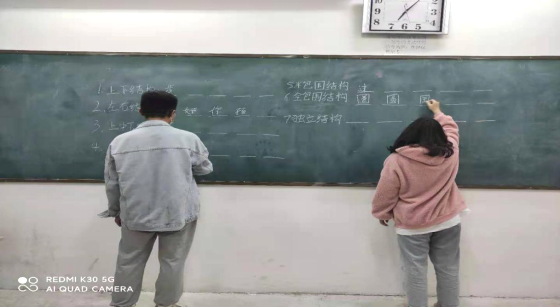 此次活动分为两组分别上讲台上写出黑板上对应结构的字。这次的活动不仅对白天老师的专业课进行拓展还开阔了同学们的思想,使无聊的晚自习变得有趣,增加了同学们的互动,同时也加强了同学们的互帮互助,团结的意识、不服输的精神。最后这次的创意写字比拼活动由第二组获胜告终。