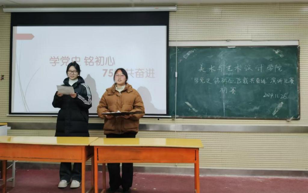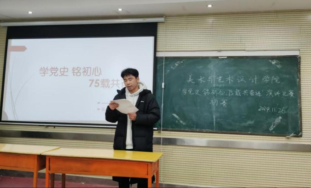12月1日,美术与艺术设计学院团总支在敏行楼201室举办了“学党史铭初心,75载共奋进”演讲比赛初赛。