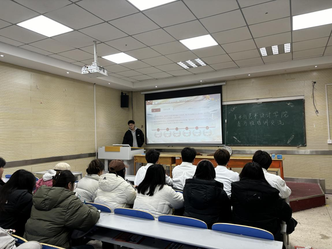 为进一步加强我院学生干部思想政治教育,提升纪律意识,培养新时代政治坚定、理想崇高、能力过硬的青年马克思主义者,美术与艺术设计学院团总支于3月9日在敏行楼201会议室开展青马班培训会。本次课程由省级青马工程优秀学员袁浩鹏做经验分享。