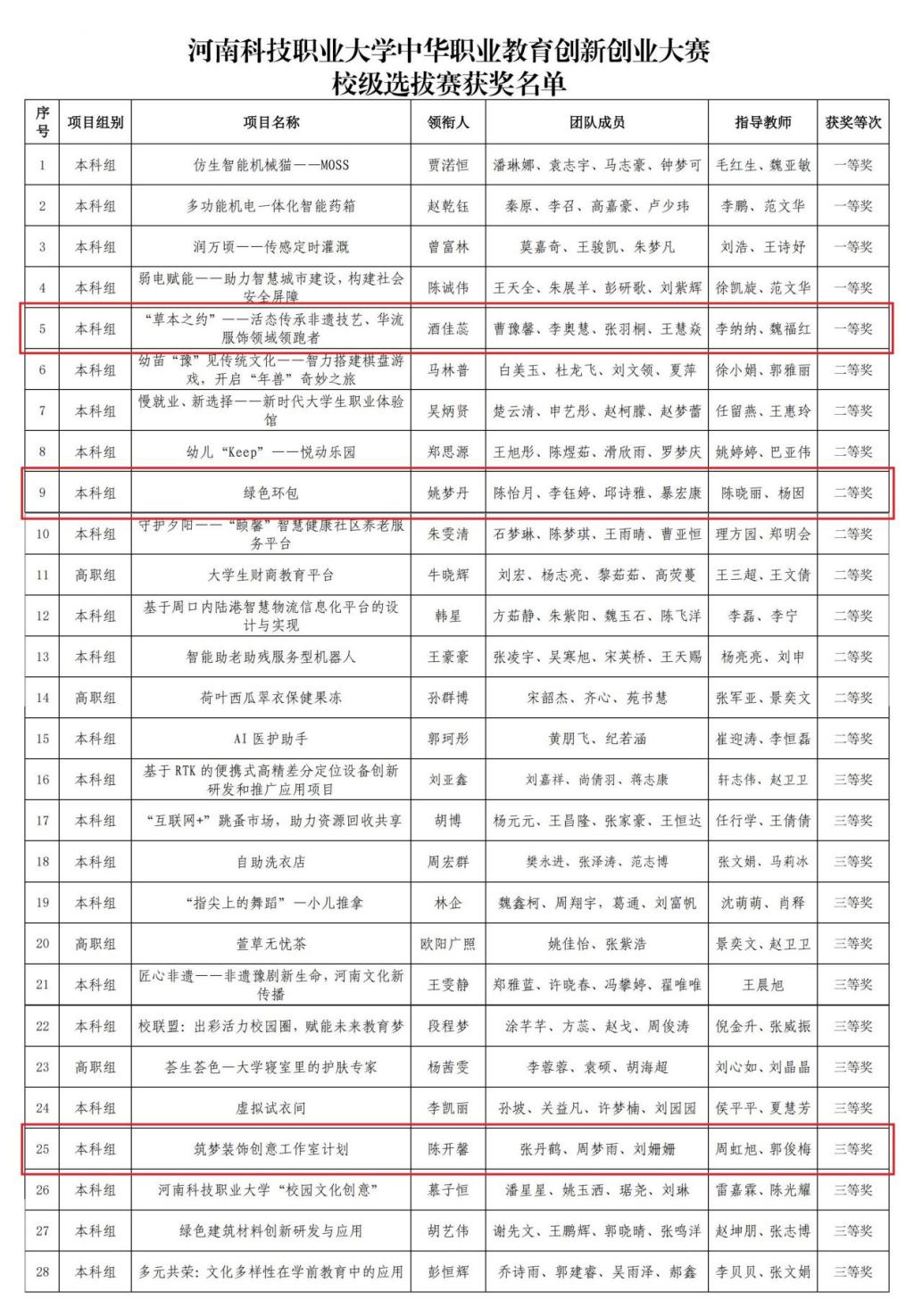 赛后学校发布了《河南科技职业大学中华职业教育创新创业大赛校级选拔赛获奖名单》,我院3组学生创业项目在本次比赛中获奖,其中《“草本之约”--活态传承非遗技艺、华流服饰领域领跑者》项目获一等奖,项目成员为酒佳蕊、曹豫馨、李奥慧、张羽桐、王慧焱,指导教师为李纳纳、魏福红;《绿色环包》项目获二等奖,项目成员为姚梦丹、陈怡月、李钰婷、邱诗雅、暴宏康,指导教师为陈晓丽、杨囡;《筑梦装饰创意工作室计划》项目获三等奖,项目成员为陈开馨、张丹鹤、周梦雨、刘姗姗,指导教师为周虹旭、郭俊梅。