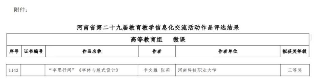 近日,河南省教育厅发布《关于河南省第二十九届教育教学信息化交流活动评选结果的公示》(教资保函〔2025〕259 号),河南科技职业大学多件作品脱颖而出,其中美术与艺术设计学院李文雅、张莉老师创作的“字里行间”《字体与版式设计》作品斩获三等奖。