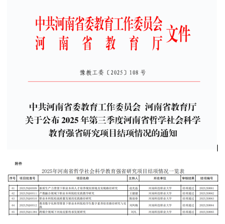 近日,《中共河南省委教育工作委员会河南省教育厅关于公布2025年第三季度河南省哲学社会科学教育强省研究项目结项情况的通知》豫教工委〔2025〕108号文件已正式下发。我校共有5项研究课题结项,其中我院刘凡老师主持的《跨媒介视域下河南皮影传承发展研究》顺利通过结项评审。