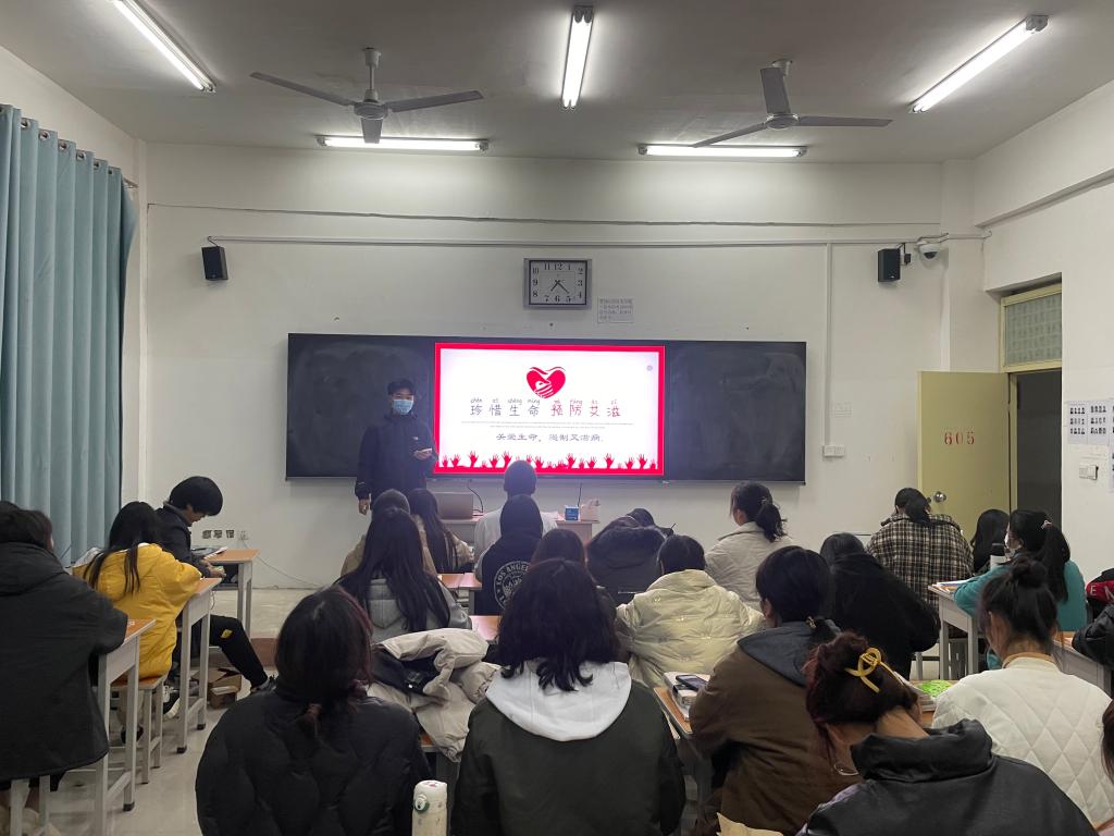 2021年11月22日,21级本科服装与服饰设计二班的同学在团支书张洪福和众班委的组织下,在敏行楼605开展了“呵护生命,预防艾滋”主题活动。