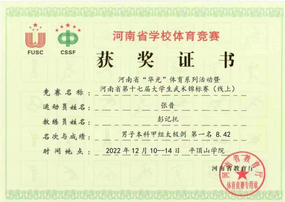 2022年12月10日至14日,河南省教育厅举办的河南省“华光”体育系列活动暨河南省第十七届大学生武术锦标赛(线上)活动中,我院学生张普在男子本科甲组太极剑项目中取得第一名!