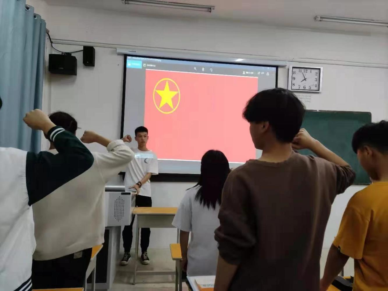 环境艺术设计专科一班全体学生在团支书的带领下一起庄严隆重的起立,全体举起了右拳,面对的大屏幕显示的团旗,每一个人都非常的庄严,声音饱满洪亮,把每一个人都展示对中国共青团的敬重与热爱。