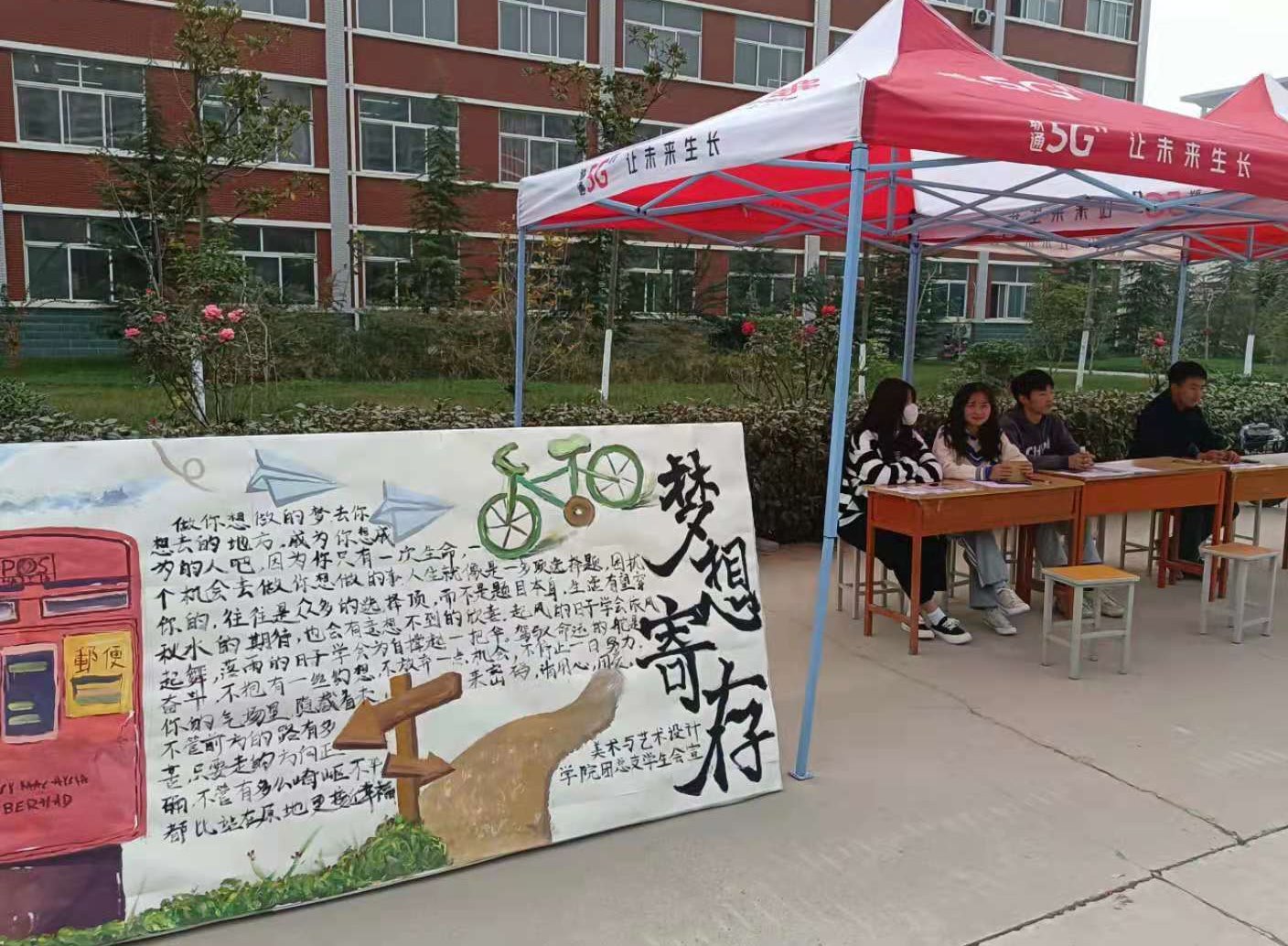 美术与艺术设计学院团总支于11月1日-11月7日在我校第一,第二餐厅门口举办以“梦想寄存”为主题的活动。目的为引导学生不仅要当语言上的巨人,更要做行动上的巨人,使学生认真思考自己的未来,找寻自己的梦想,并为之努力。