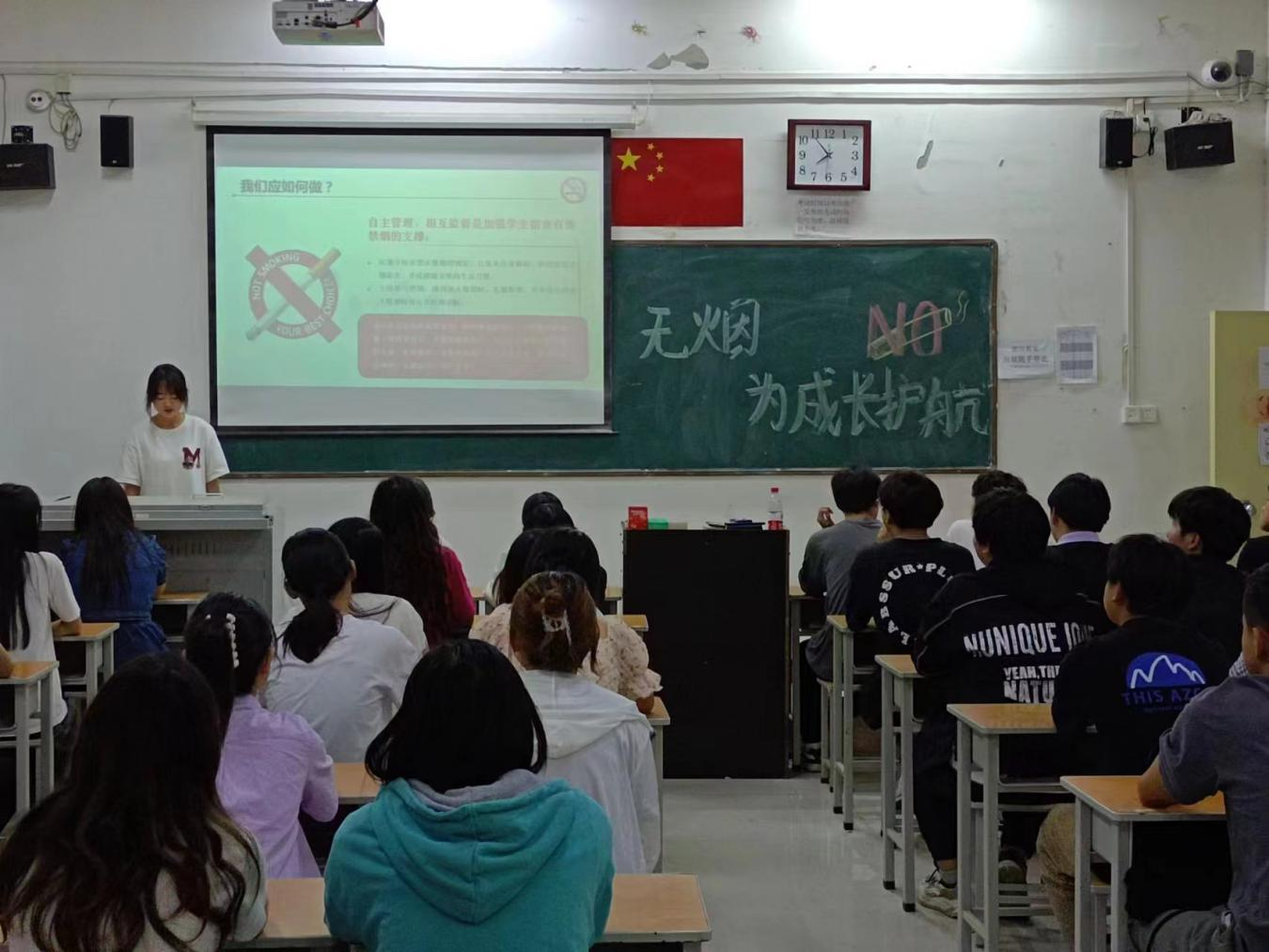 在会上,各班班委通过短视频、图片等形式讲述吸烟现状、青少年吸烟的心理、吸烟对人体哪些危害、二手烟的危害以及如何禁烟控烟等五个方面向同学进行介绍。通过学习,同学们充分了解吸烟和二手烟暴露的严重危害,并积极响应号召发出倡议:一是拒绝吸第一支香烟;二是积极开展戒烟、灭烟宣传,拒绝做二手烟民;三是行动起来,建设无烟清新校园。广大同学纷纷表示,珍爱生命,拒绝吸烟,从我做起,健康体魄。