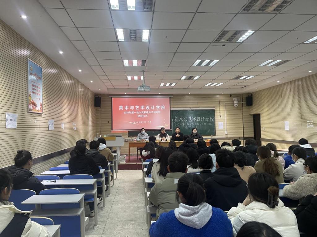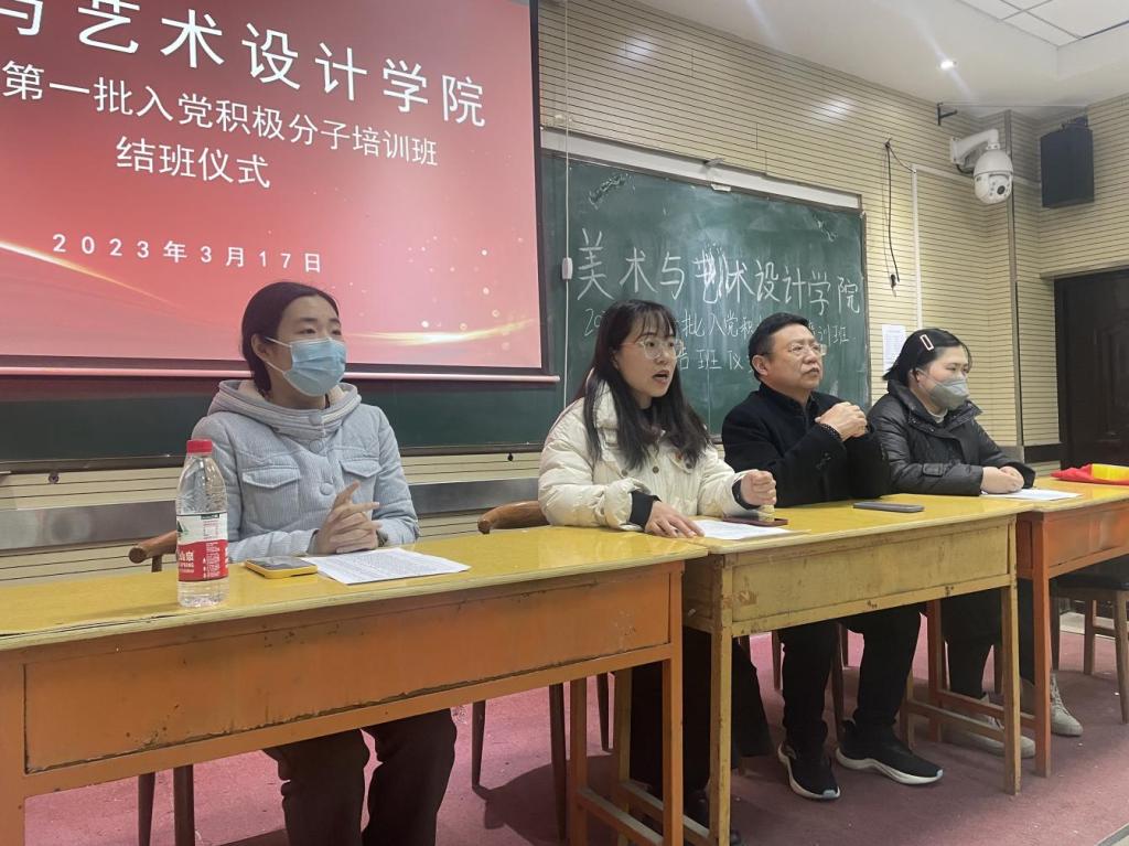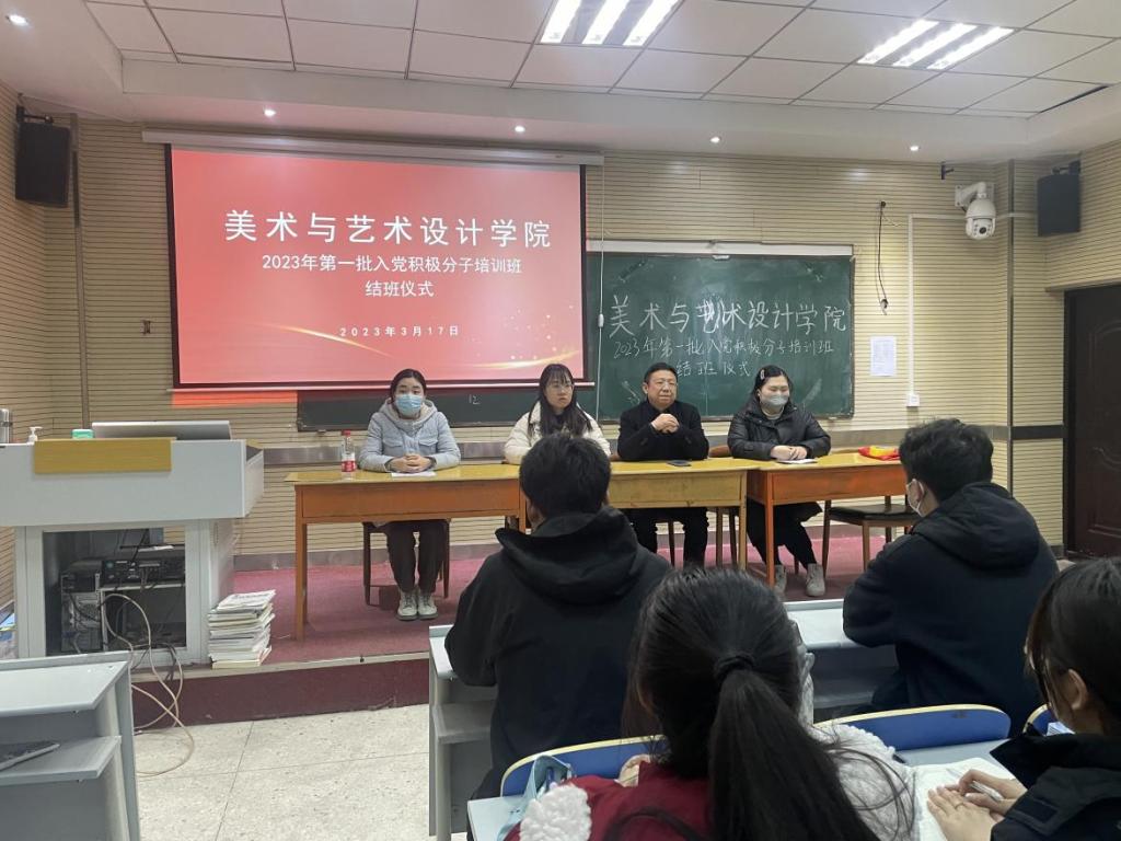 为扎实做好学院入党积极分子的培训工作,切实提高入党积极分子的基础理论素养,规范党员发展。2023年3月20日,美术与艺术设计学院2023年第一批入党积极分子培训班结班仪式在敏行楼201会议室召开,学院党总支书记刘春华、党总支副书记李文雅、团总支书记张冰、学管办主任王意文出席,培训班全体学员参加。