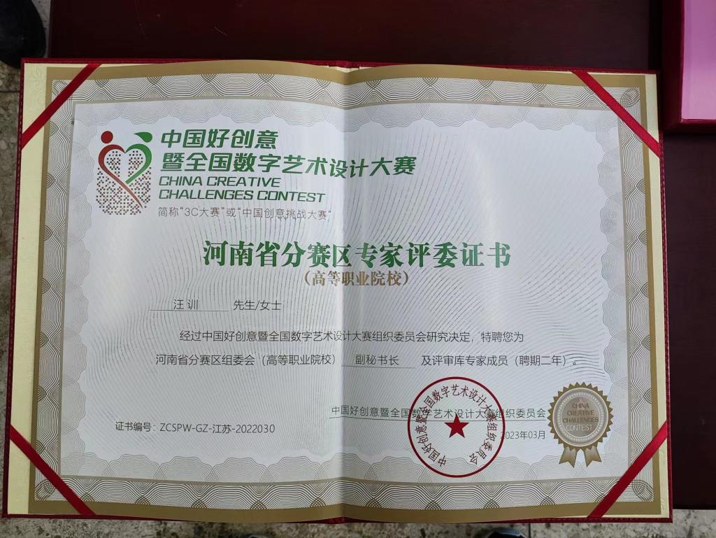 2023年3月20日,美术与艺术设计学院教职工党支部书记汪训同志,经过中国好创意暨全国数字艺术设计大赛组织委员会研究决定,聘请为河南省分赛区组委会(高等职业院校)副秘书长及评审库专家成员(聘期二年)。