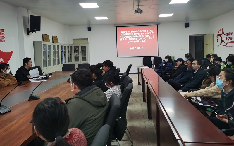 为深入贯彻习近平新时代中国特色社会主义思想和全国教育大会精神,落实《深化新时代教育评价改革总体方案》《关于深化新时代教育督导体制机制改革的意见》《国家职业教育改革实施方案》《关于推动现代职业教育高质量发展的意见》有关要求,认真学习职业本科评估体系,全面提高人才培养能力,稳步发展职业本科教育,与会人员集体学习了教育部办公厅关于印发《本科层次职业学校本科教学工作合格评估指标和基本要求(试行)》的通知(教督厅函[2021]1号)文件内容。