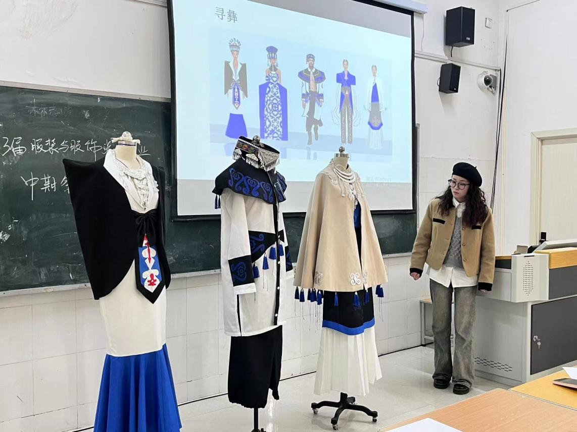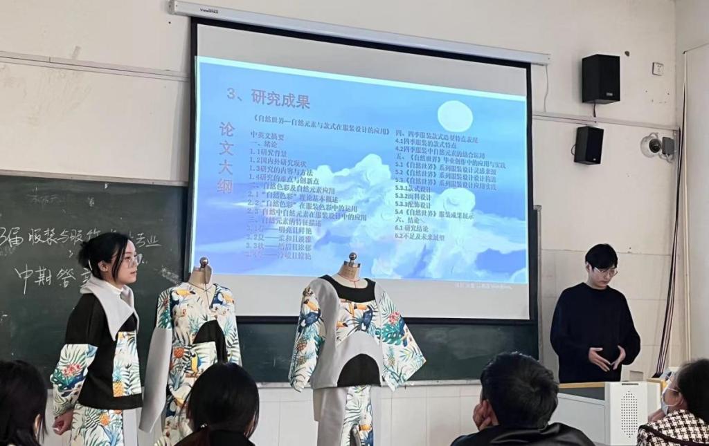 本次中期检查共有89名本科生参加,学生按照名单分为三组,本次中期检查采用实物讲解与文稿汇报相结合的形式进行。首先,学生通过文稿讲解介绍毕业设计的制作过程,并把已经制作完成的成衣穿到服装模特上进行展示,指导教师们根据文稿中的效果图对学生制作的成衣分别进行详细的点评,指出存在的问题和需要修改的细节。每位毕业生也分别阐述了毕业设计在实际制作中遇到的困难,指导教师们分别进行了答疑解惑。