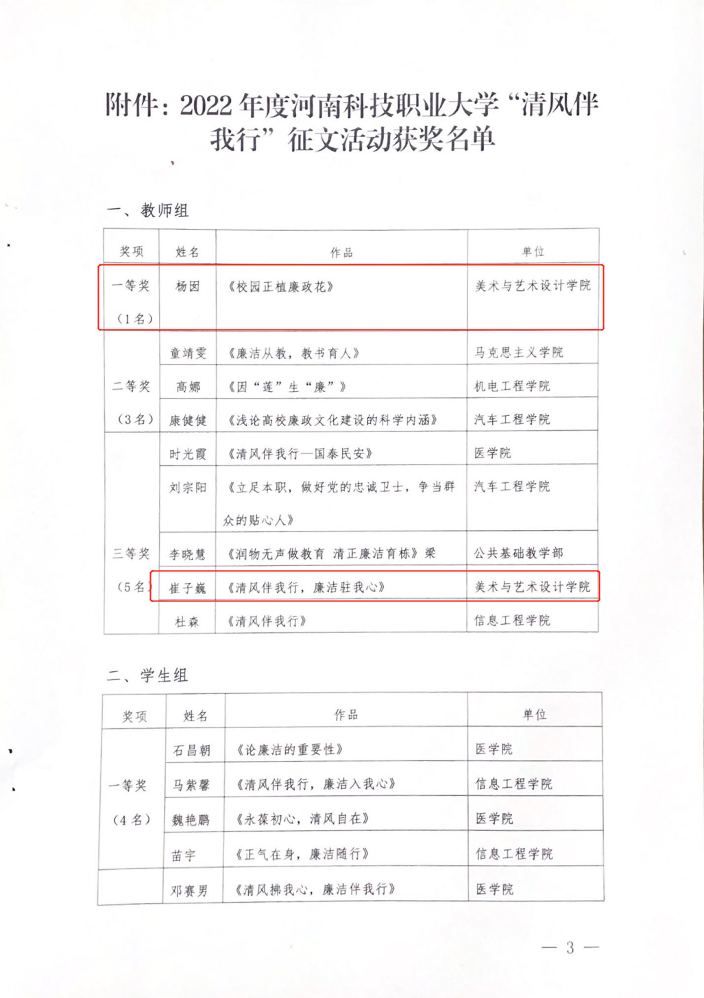 经活动组委会评选,评出教师组一等奖1名、二等奖3名、三等奖5名,学生组一等奖4名、二等奖7名、三等奖10名、参与奖33名,并于3月28日举办了表彰大会。其中我院杨囡老师摘得教师组一等奖,崔子巍老师和学生党员王哲分别获教师组和学生组三等奖。