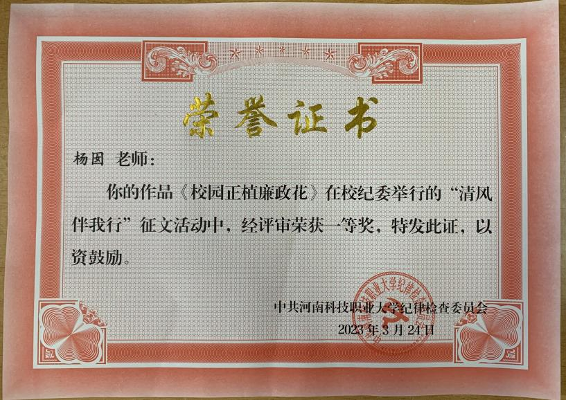 为深入贯彻落实党中央《关于加强新时代廉洁文化建设的意见》,激发广大党员干部读廉、悟廉、说廉热情,大力弘扬清正廉洁、作风正派的良好风气,进一步教育引导广大教职工党员、学生党员树立廉洁从政意识,引导大家向身边的勤廉模范看齐,打造良好的政治生态环境。近期,学校纪委在全校师生中大力开展“清风伴我行”廉政主题征文活动,我院党总支共有三篇征文参选。