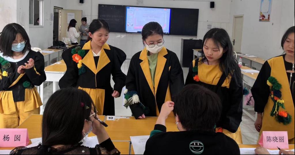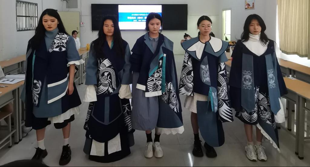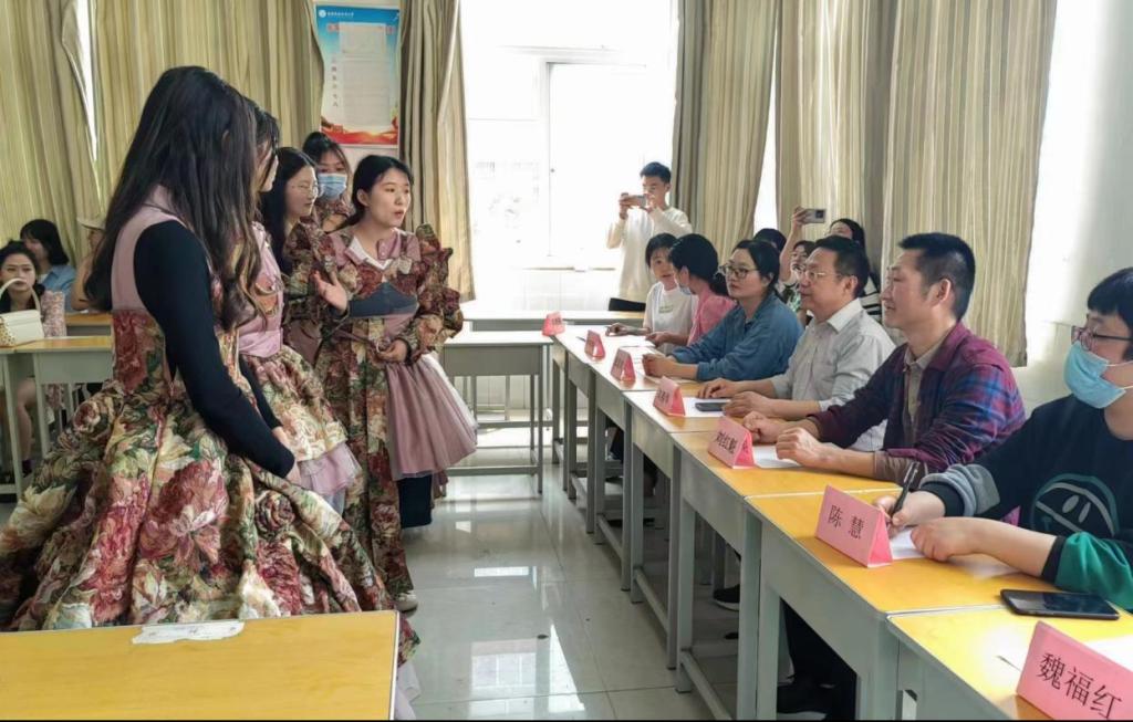 本次终期答辩共有89名本科生参加,学生按照名单分为三组,本次终期答辩采用实物讲解与论文审查相结合的形式进行。首先,学生通过文稿讲解介绍毕业设计成衣制作过程。在此过程中,模特着成衣在现场进行展示。指导教师们根据文稿中的效果图对学生制作的成衣进行点评,指出存在问题。