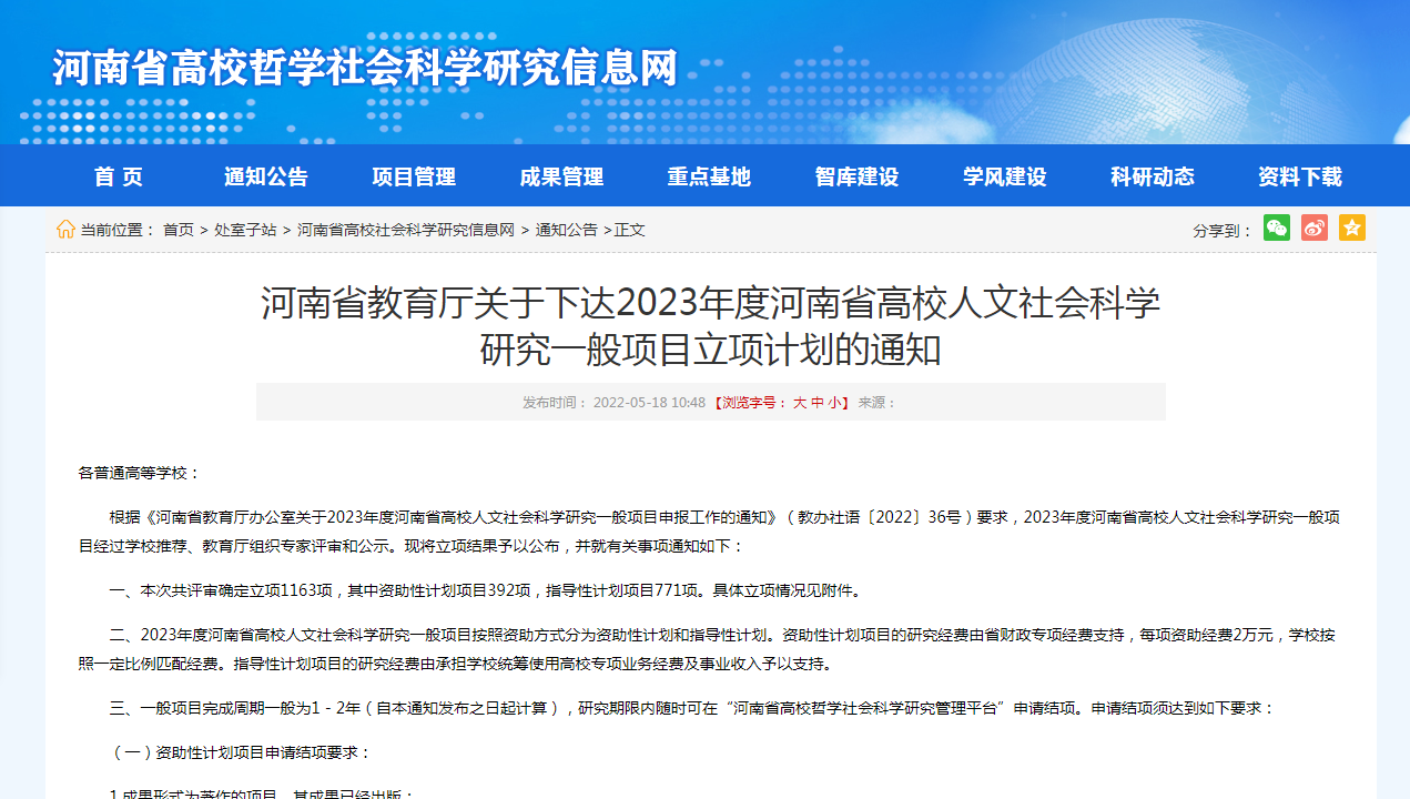 近日,河南省教育厅下发了《关于2023年度河南省高校人文社会科学研究一般项目立项计划的通知》,我院有3个项目荣批立项,立项名单如下: