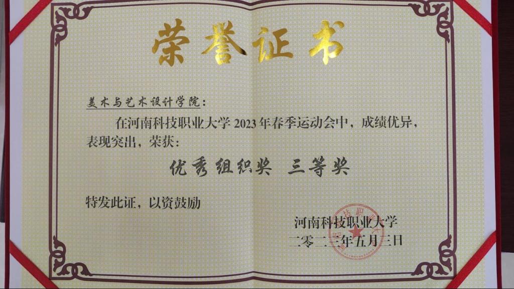 2023年4月27日河南科技职业大学举办了2023年春季运动会,各学院积极响应号召,组织同学们参加本次运动会。在本次春季运动会中,我院荣获“优秀组织奖”荣誉称号。