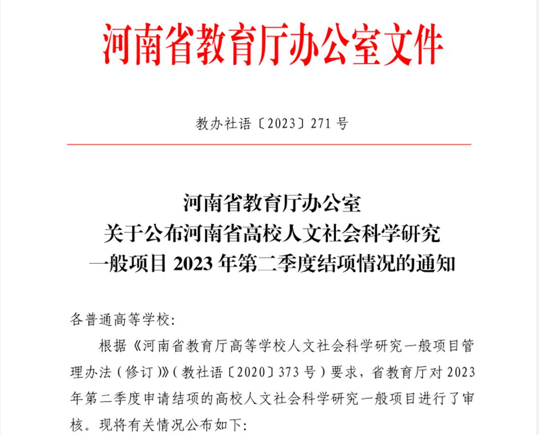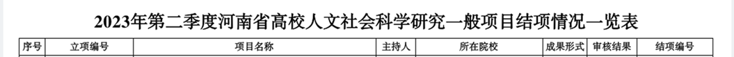 近日,河南省教育厅办公室发布了《河南省教育厅办公室关于公布河南省高校人文社会科学研究一般项目2023年第二季度结项情况的通知》(教办社语〔2023〕271号),我院有李彬、吴衡、刘凡三位党员教师分别主持的研究项目顺利结项。