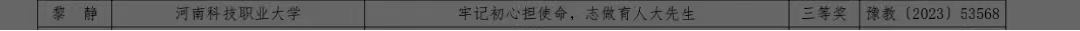 近日,河南省教育厅办公室发布了《河南省教育厅办公室关于公布“奋进新征程,志做大先生”师德主题教育征文、演讲比赛和师德师风优秀案例评选结果的通知》(教师〔2023〕291号),我院党员教师黎静以“牢记初心担使命,志做育人大先生”为题获师德主题教育征文教师组三等奖。