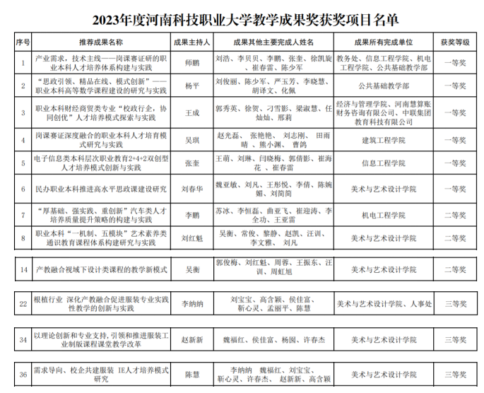近日,学校发布了《2023年度河南科技职业大学教学成果奖获奖项目名单》,我院党员教师刘春华获一等奖,党员教师刘红魁、吴衡获二等奖,党员教师李纳纳、赵新新及教师陈慧获三等奖。