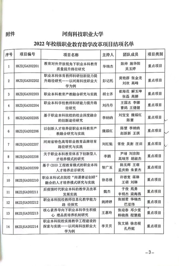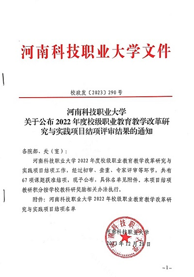 近日,学校发布了《河南科技职业大学关于公布2022年度校级职业教育教学改革研究与实践项目结项评审结果的通知》,(校政发〔2023〕290号),我院教师主持的项目6项顺利结项,其中重点项目结项3项,主持人分别为李纳纳、魏福红、刘红魁;一般项目结项3项,主持人分别为刘宝宝、魏亚敏、陈婉媚。