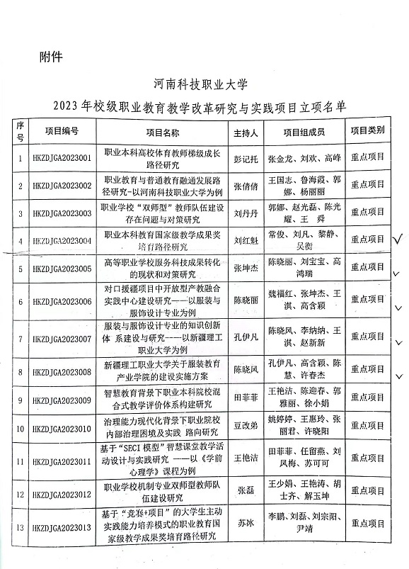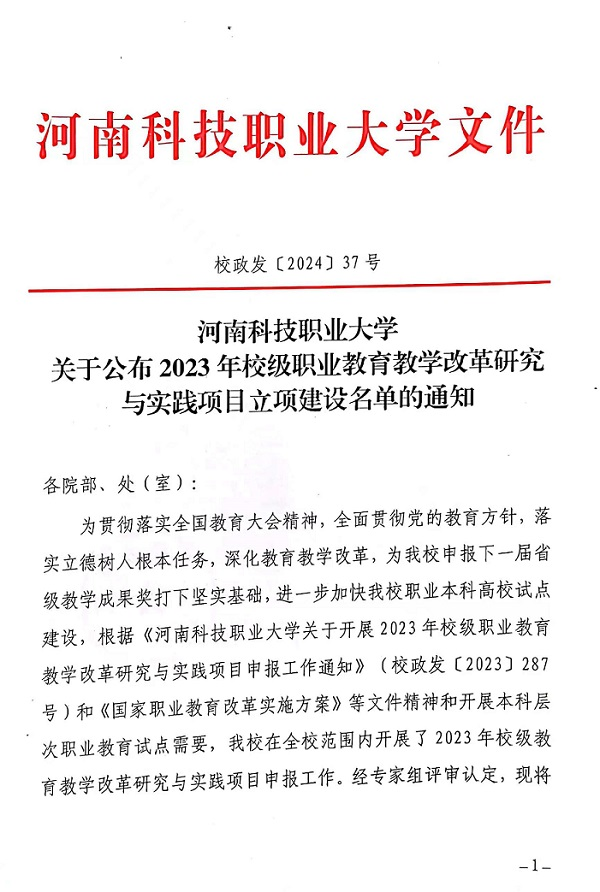 近日,我校发布了《河南科技职业大学关于公布2023年职业教育教学改革研究与实践项目立项建设名单的通知》(校政发〔2024〕37号),我院教师主持的项目脱颖而出,成功立项重点项目5项,主持人分别为张坤杰、陈晓丽、孔伊凡、陈晓风、刘红魁;一般项目7项,主持人分别为郭俊梅、刘爽、杨智慧、侯佳富、石艳艳、王文静、许春杰。
