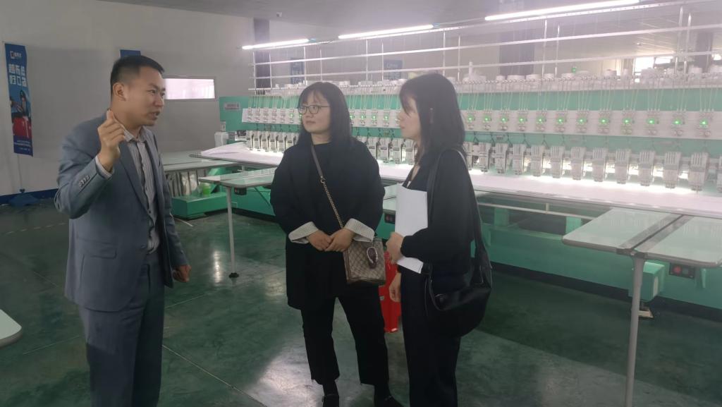 河南越布悠科技有限公司负责人何斌带领学院调研团队进行了参观。参观过程中,对公司发展情况、产业布局、人才需求情况进行了介绍,特别是对刺绣产品的设计生产,实体店和线上销售以及出口情况进行了详细的介绍。
