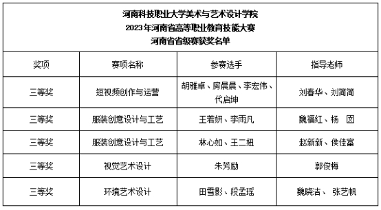 2023年河南省高等职业教育技能大赛评选结果公布,美术与艺术设计学院师生队伍在“短视频创作与运营”“服装创意设计与工艺”“视觉艺术设计”“环境艺术设计”赛项中成绩优异均获三等奖,在获奖数量上实现新突破,刷新了我院在该赛事的最好成绩。