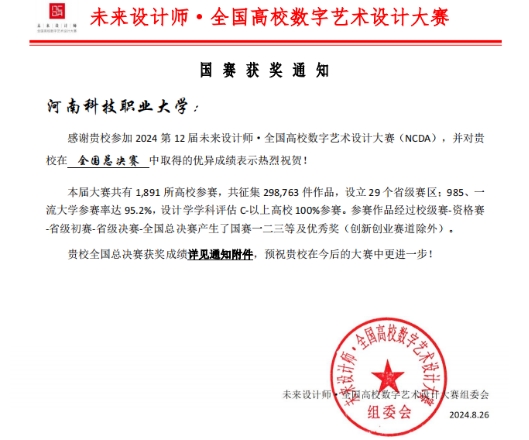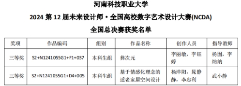 近日获悉,我校美术与艺术设计学院师生在2024第12届未来设计师·全国高校数字艺术设计大赛(NCDA)中斩获全国赛三等奖两项,省级赛二等奖3项、三等奖4项。