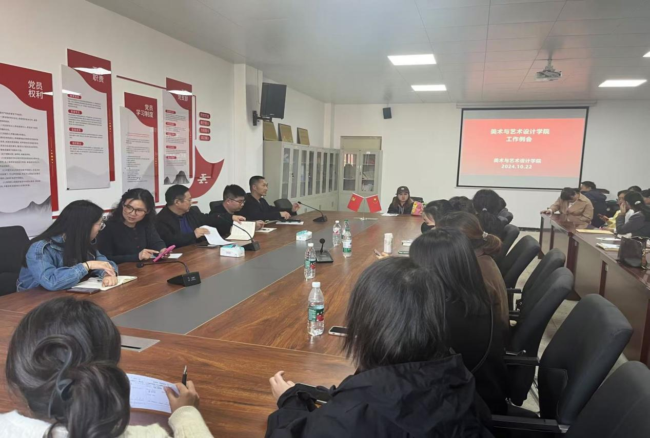 10 月 22 日,美术与艺术设计学院在实训中心 625 会议室召开了工作例会,学院院长刘春华主持会议,副书记李文雅、孔建富,副院长刘红魁、李纳纳及全体中层干部、教师出席。