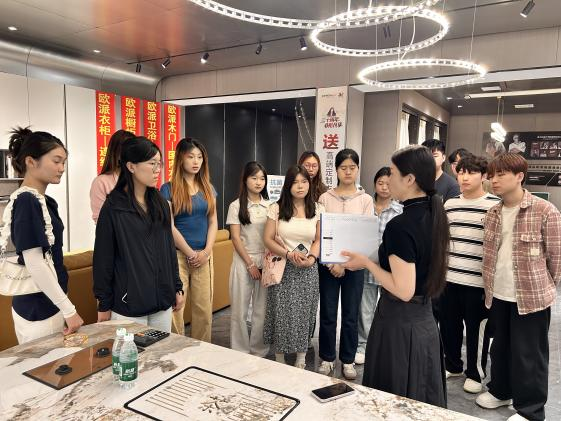 师生团队首先参观了欧派家居的智能展厅,欧派家居设计总监通过全屋定制、厨房空间、整装设计等案例,详细讲解了环境艺术设计在商业落地中的实际应用,强调“用户需求驱动设计创新”的理念。师生们对欧派家居将艺术美学与功能性结合的设计思路表现出浓厚兴趣,纷纷记录细节并与企业设计师展开互动。