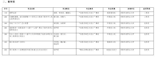 其中,学生组获一等奖、二等奖、三等奖各1项、优秀奖5项,作品涵盖数字媒体设计、环境设计、服装设计等多个类别,深度融合河南传统文化与现代设计理念。教师组表现亮眼,收获二等奖、三等奖各1项及优秀奖5项,作品聚焦产教融合、非遗转化等前沿方向。