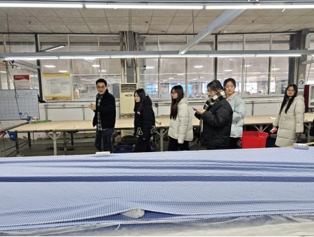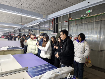 项城市松鑫服装有限公司是本地服装行业的代表性企业,拥有完整的服装产业链条、先进的生产设备和完善的管理体系。在企业相关负责人的热情接待下,师生们依次参观了公司的设计研发部、面料检测中心、智能裁剪车间、数字化生产流水线及成品展示厅。