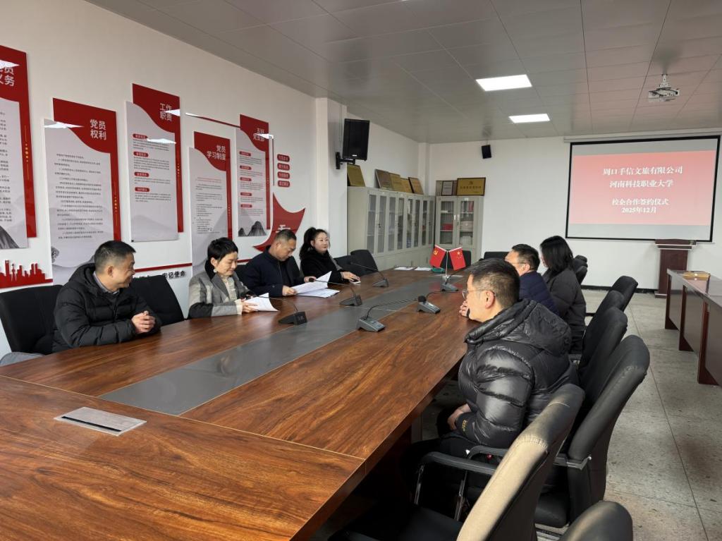12月29日,河南科技职业大学美术与艺术设计学院与周口手信文旅有限公司校企合作签约仪式在学校实训中心625隆重举行。仪式由周口手信文旅有限公司负责人靳玉洁、昌建地产总经理何峰,河南科技职业大学美术与艺术设计学院院长刘春华、副院长魏亚敏、副院长王振东及美术与艺术设计学院教师代表共同见证签约。
