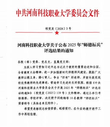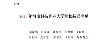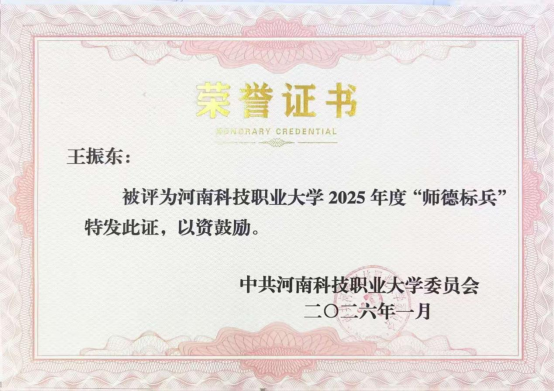 1月9日,河南科技职业大学2025年校级“师德标兵”评选结果出炉,我院环境艺术设计教研室教师王振东荣获“师德标兵”荣誉称号。